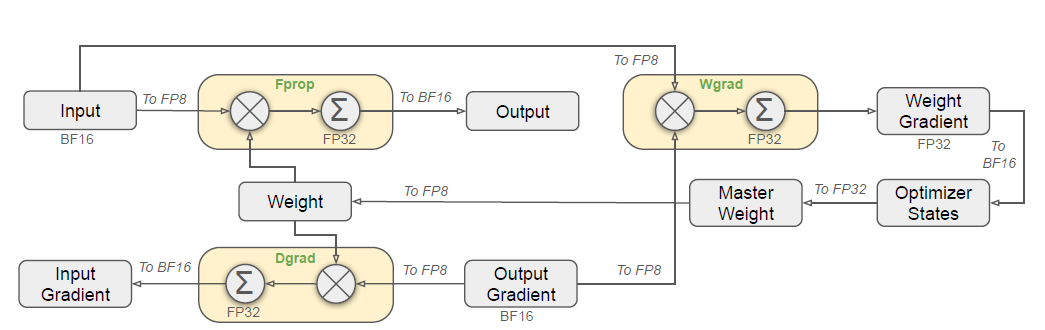 FP8混合精度训练框架:首次在超大规模模型上验证了FP8低精度训练的可行性与有效性,显著降低了计算资源需求并加速了训练过程。