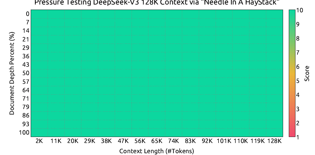 图8: 在”Needle In A Haystack” (NIAH) 测试集上的评估结果。DeepSeek-V3 在128K 以内的上下文窗口长度下,都表现很好。