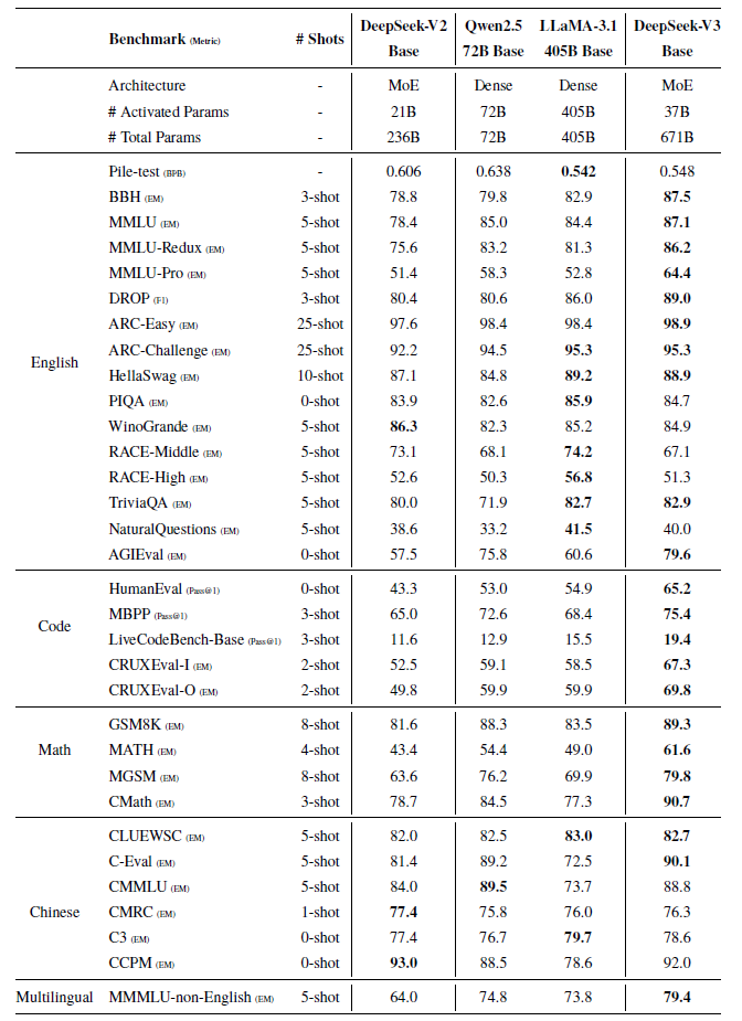 表3: DeepSeek-V3-Base 与其他代表性的开源基础模型的比较。所有模型在我们的内部框架中进行评估,并共享相同的评估设置。得分差距不超过0.3 的模型被认为处于同一水平。DeepSeek-V3-Base 在大多数基准测试中表现最佳,特别是在数学和代码任务上。