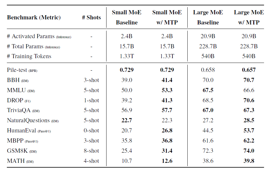 实验设置:在两个不同规模的基线模型上验证MTP策略,小规模模型包含15.7B参数,使用1.33T Token数据;大规模模型包含228.7B参数,使用540B Token数据。