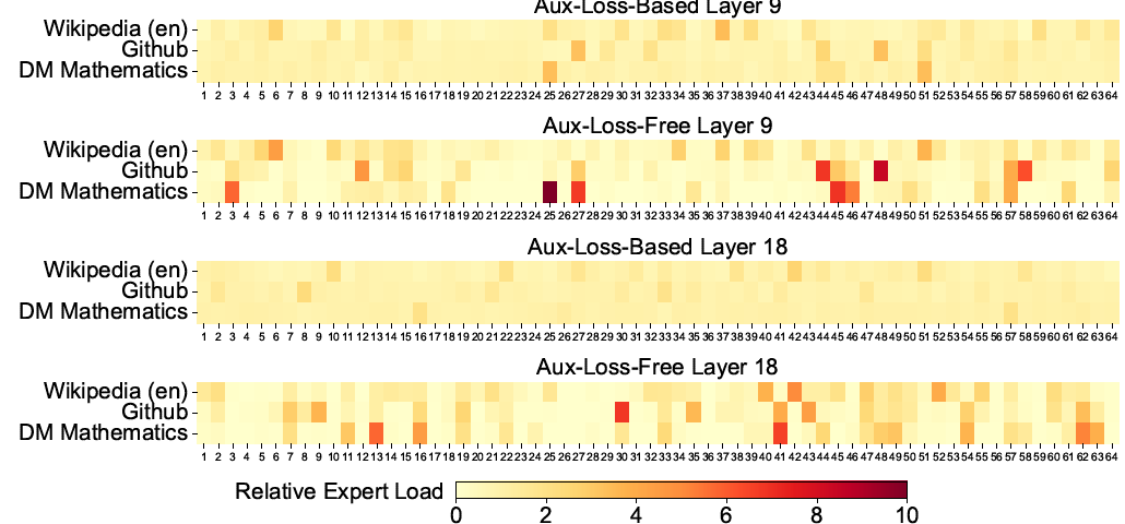 无辅助损失的负载均衡:对于MoE 模型,不均衡的专家负载会导致路由崩溃,并在专家并行的场景中降低计算效率。传统的解决方案通常依赖于辅助损失来避免负载不均衡。然而,过大的辅助损失会损害