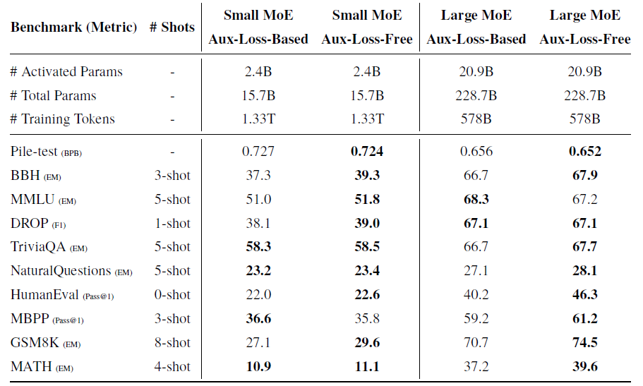 表5: 无辅助损失平衡策略的消融结果。与纯粹基于辅助损失的方法相比,无辅助损失策略在大多数评估基准上始终实现了更好的模型性能。