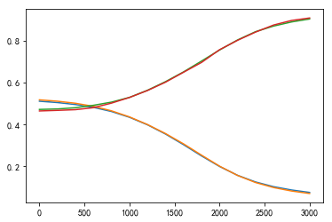 从上面的结果可以看到,使用感知机模型,花费600秒左右的时间,训练3000个epoch之后达到了0.9073的准确率,这个二分类的准确率比上一节使用传统编程方法的0.9674的准确率还低。