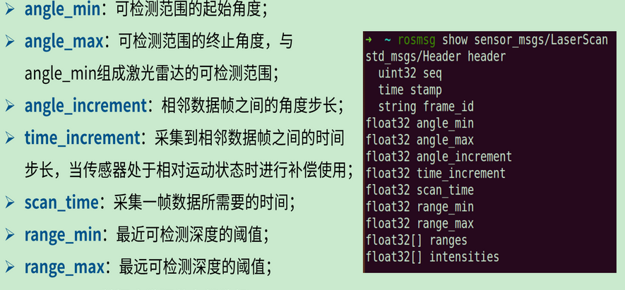 (3)ros中激光雷达数据消息是 sensor_msgs/LaserScan ,内容如下: