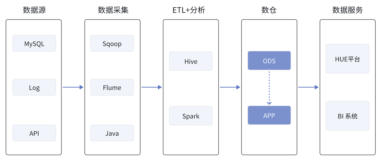 下图是早期的 CDH 架构示意图,MySQL 数据通过 Sqoop 全量导入至 Hive,埋点数据通过 Java 程序清洗后进入 Flume 的 source 端,并最终 sink 到 Hive 的分区表中,离线数仓任务的 ETL 由 Hive 执行,批处理作业则通过 Spark SQL 运行,所有任务都从 ODS 层出发直接进入到 APP 层。数据开发与分析工作则依赖 CDH 自带的 Hue 平台,任务调度依赖 easyScheduler,最终与自主研发的报表平台对接,实现数据的可视化。