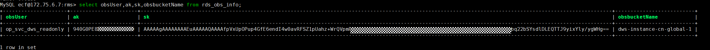 2、登录rms数据库查询连接OBS的AK、SK、桶名等信息