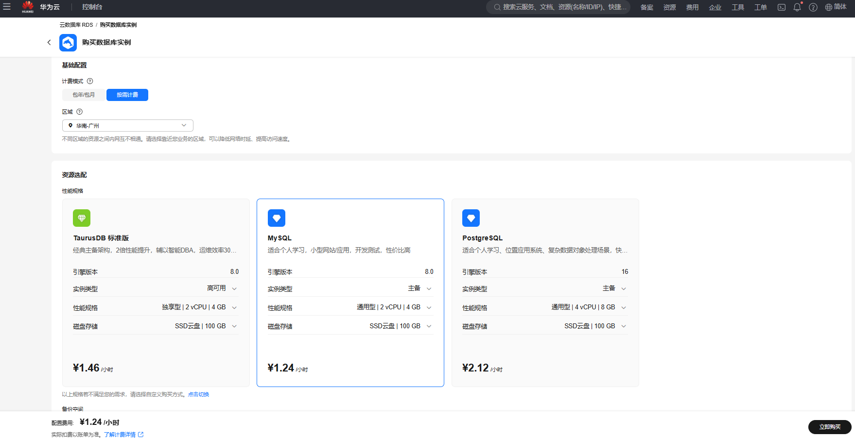 通过RDS服务购买,以下是快速购买页面,快速做实验也够用了,创建完到详情页面重置一下密码;真正应用开发建议自定义购买