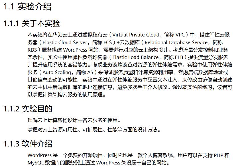 软件:一套MySQL数据库(通过RDS服务购买),一个WordPress应用软件(部署在购买的ECS虚机上)。