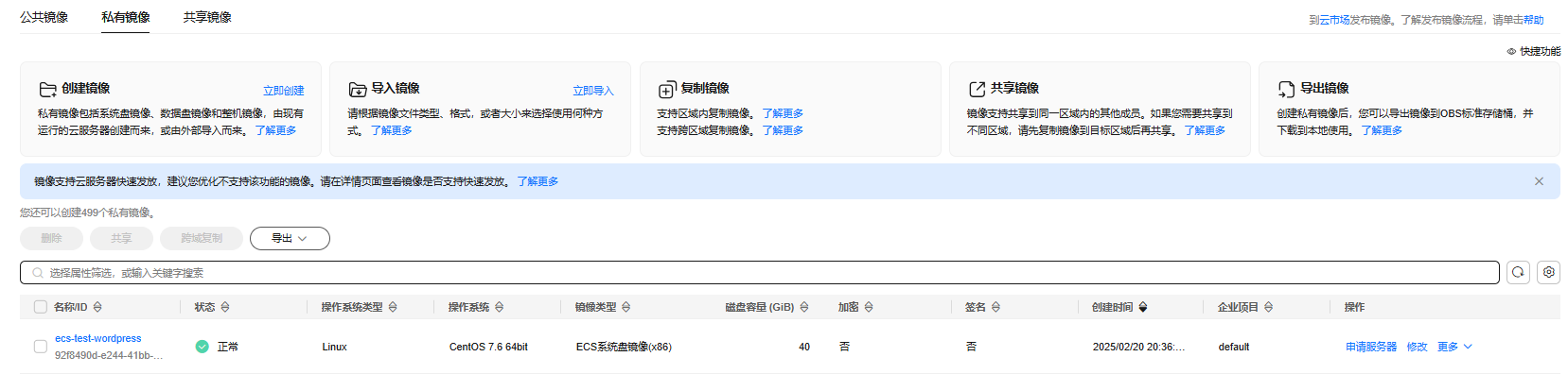 使用IMS服务制作镜像,用于配置后面的弹性伸缩配置,负载高时自动弹性创建出的新虚机,该虚机即使用安装好WordPress软件的镜像。