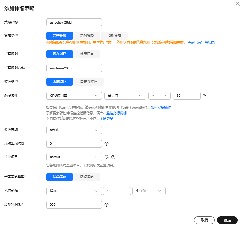 创建完“弹性伸缩配置”,创建“弹性伸缩组”,绑定“弹性伸缩策略”(策略类型有告警、定时、周期),比如下图选择告警策略,CPU利用率大于80%,5分钟内连续出现3次,则弹一台ECS进来。