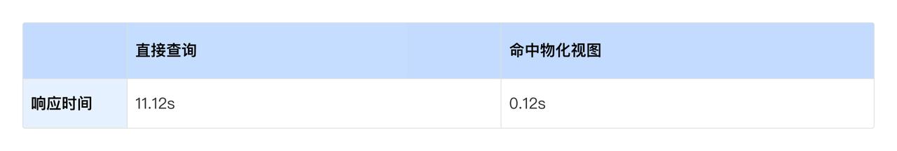 下表为命中物化视图前后的性能差异,使用透明改写之后,查询速度较之前提升约 93 倍。