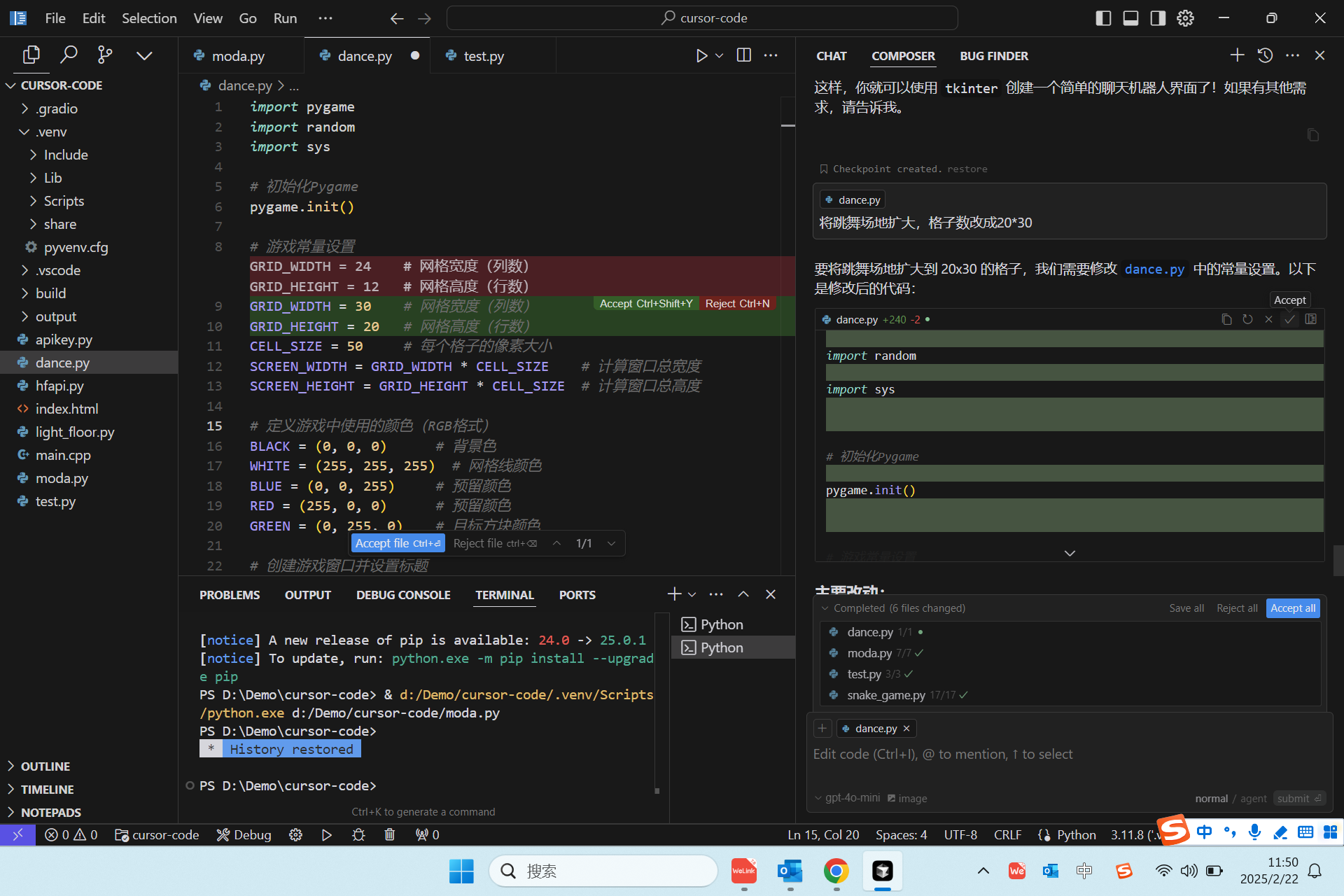 而用Cursor则完全不一样了,例如要开发一个python方格跳舞游戏,在chat框里输入一句话,它就能自动生成整个python文件,运行后觉得格子少了,在composer框里输入加大格子数量,它能生成差异化对比代码,点个对勾自动合入,觉得格子颜色太少,继续在composer里输入增加颜色,点个对勾,差异代码自动合入到主文件里了。