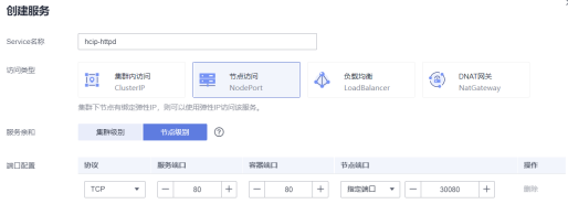 返回CCE页面,选择“工作负载>无状态负载>工作负载名称,如 hcip-httpd>访问方式”,点击“创建”。访问类型选择“节点访问”。