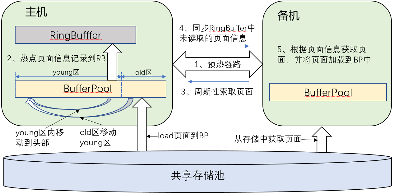 2)主机新增一个RingBuffer(环形缓冲区,简称RB),用于持续缓存BP中活动的页面,比如,当某个页面首次加载到BP中,从old区移动到young区或者young区内移动到头部,该页面都会被缓存到RB中。RB采用类似循环链表的方式,当写到尾部后,则回到头部覆盖原有数据继续写入。