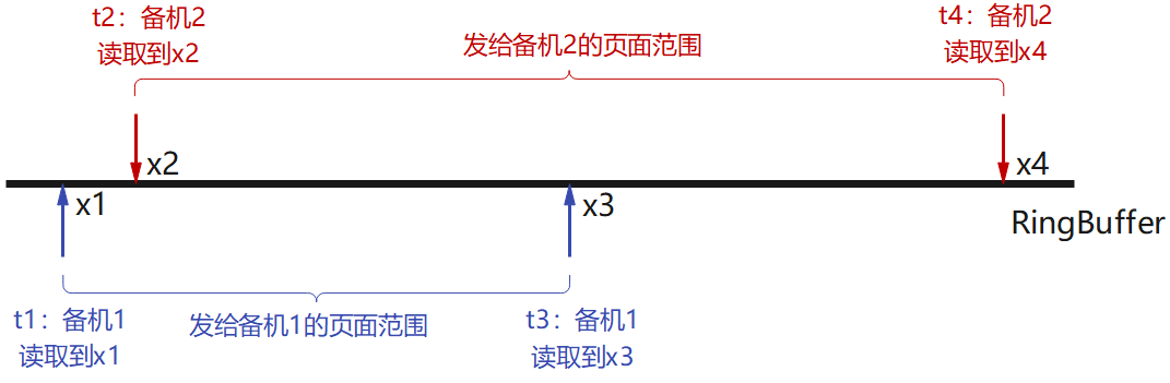 因为收到了备机1的读取请求,所以RB刷新了允许写入的范围,即后续如果不再有新的备机读取请求,RB最多完成从x4到RB尾、再从RB头到x4的页面信息写入。