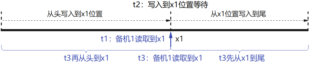 t2:RB发送最新页面在x2处的所有页面给备机2,同时将备机2的PSN刷新为PSN_t2_x2。如果后续不再有新的备机读取请求,参考单备机时的RB写入,RB最多完成从x2到RB尾、再从RB头到x2的页面信息写入。
