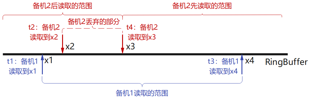 t4:由于t3时刷新了允许写入的范围,所以当写入到x2时,RB不再等待,而是继续向后写入,直到写入到x3时,收到备机2的读请求。但是从t2到t4,x2→x3这一段被写入了两次,因此,这一段第一次写入的页面信息被覆盖而丢弃。