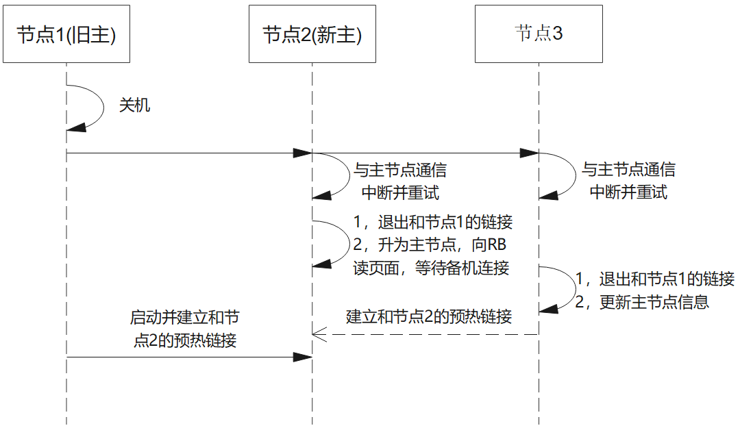 • 节点2下发升主命令后,会退出连接重试,并关闭和节点1的预热链接。升主后,开始和正常主节点一样创建RB,并向RB中写入页面,等待有备机建立预热链接向备机索取页面后,将页面同步给备机。