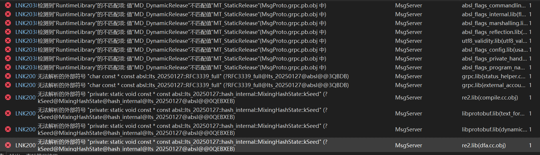 例如,Abseil库的符号(如 absl::lts_20250127::RFC3339_full)未定义,可能因为 /MT 静态库未正确链接到 /MD DLL。