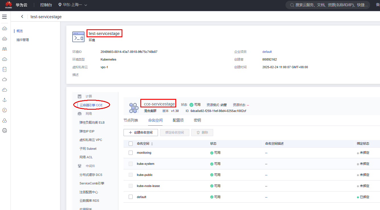 登陆ServiceStage(应用管理与运维平台)控制台,选择“环境管理”,创建环境,test-servicestage,在“云容器引擎CCE”页签下,绑定上一步创建的CCE集群,cce-servicestage。