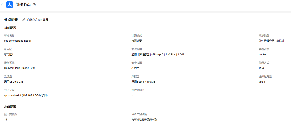 待CCE集群创建完成后,大约10-20分钟,切换到“节点管理”,为CCE集群创建节点,cce-servicestage-node1,本次实验容器引擎用docker,提交等待创建完成。
