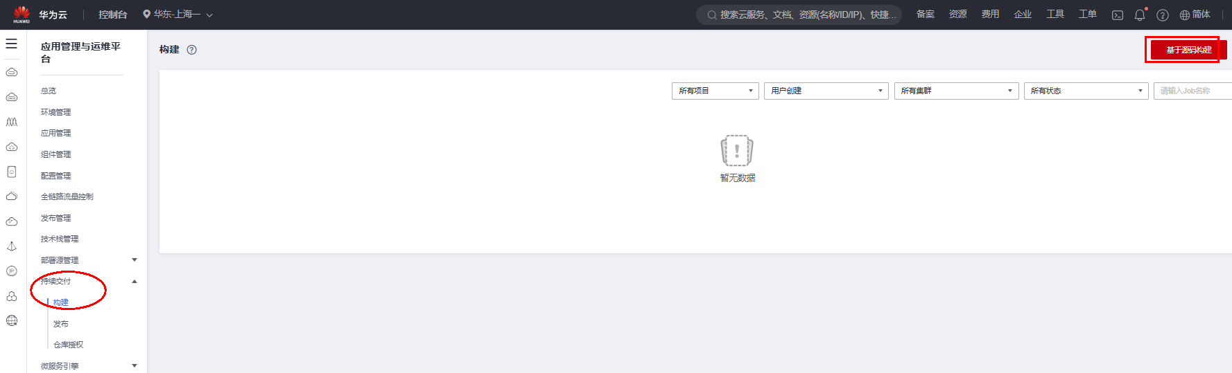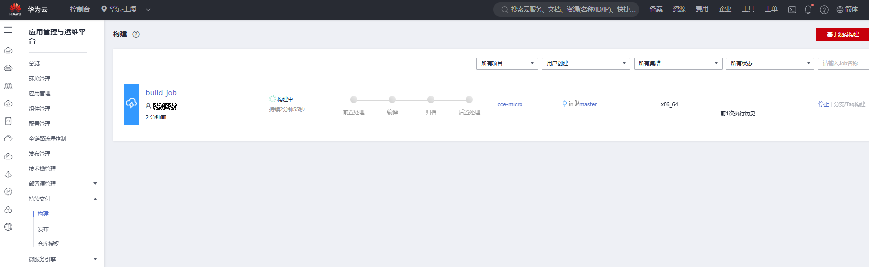 在ServiceStage控制台左侧列表中选择“持续交付”,“构建”,点击“基于源码构建”。详细步骤略过,查看实验手册。