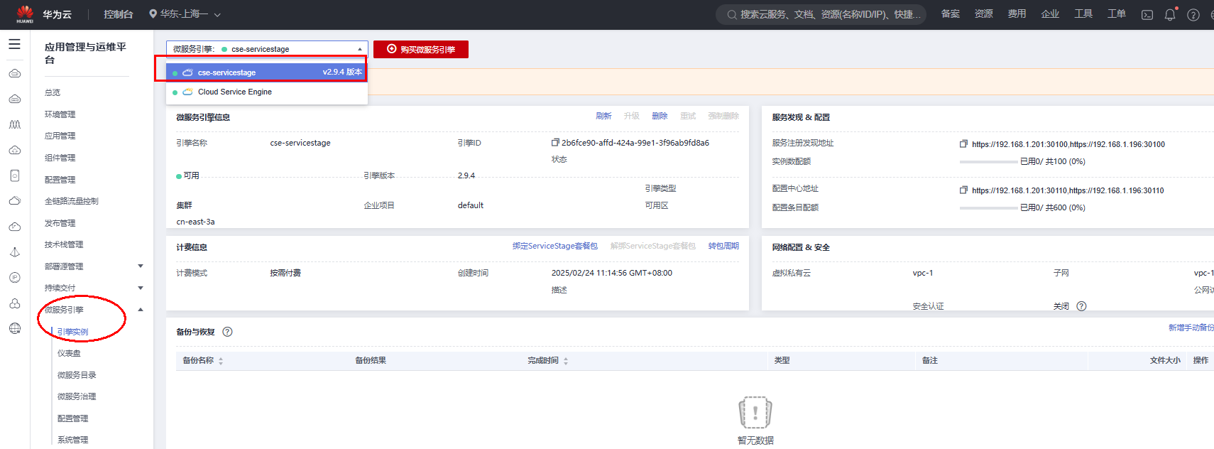 在ServiceStage控制台左侧列表中选择“微服务引擎”,“引擎实例”中,购买CSE实例,cse-servicestage,提交,预计需要31分钟。。。实际创建用了12分钟。