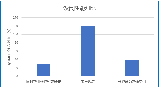 从图1中可以看到,临时禁用外键约束检查的恢复速度最快,外键转为普通索引的恢复速度稍慢,但都明显好于串行恢复。