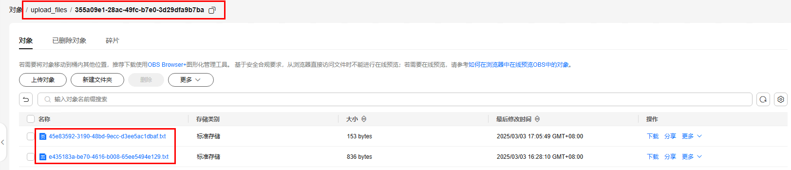 步骤7 验证文件是否存储在obs桶:访问步骤2 创建的OBS桶,知识库的文件会保存在upload_files文件夹下,表示配置成功。