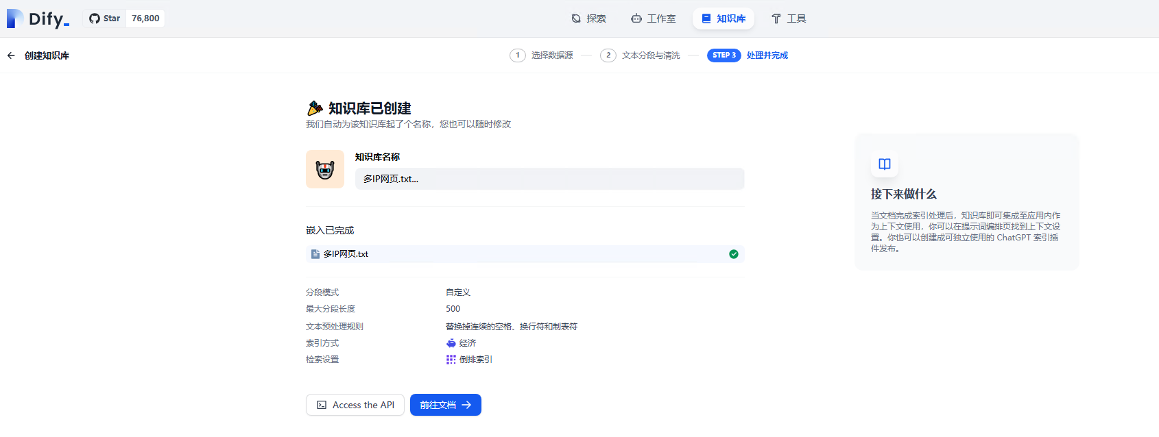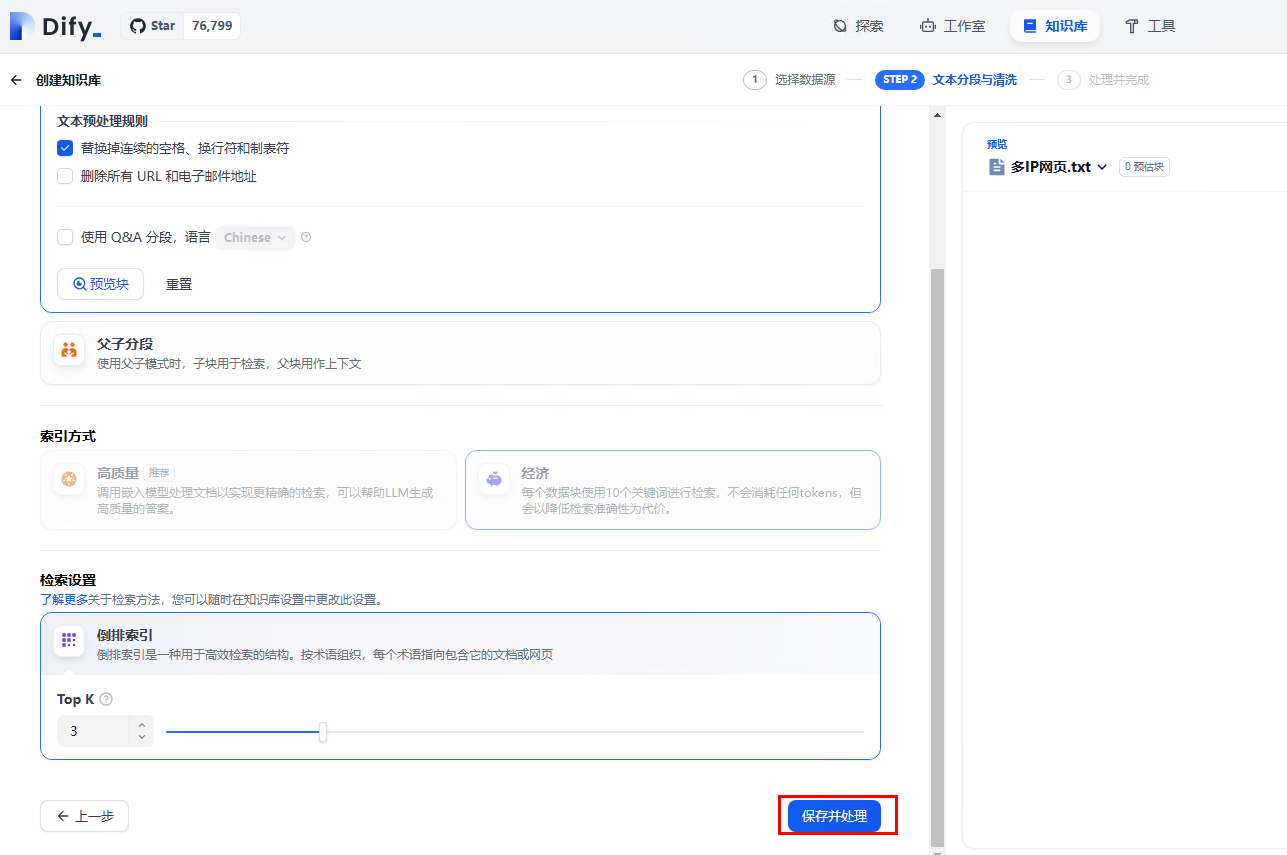 步骤6 配置知识库:按需求配置,若没有特殊需求默认即可。单击“保存与处理”,待页面提示嵌入已完成表示配置完成。
