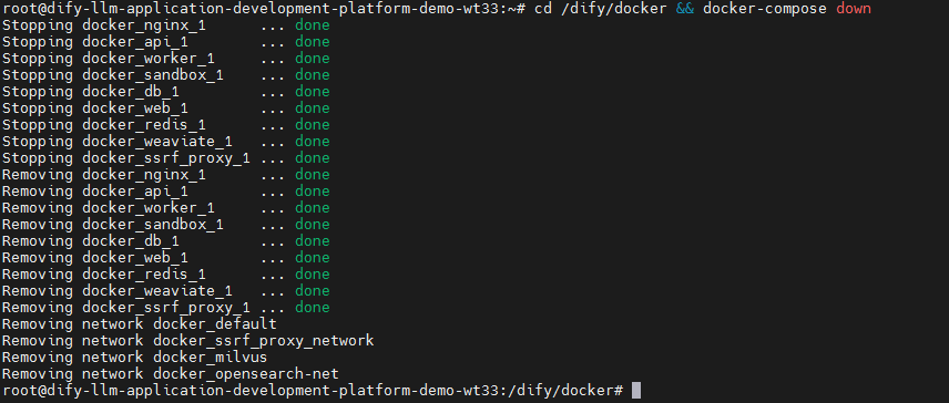 步骤3 停止并移除Dify服务:登录部署Dify的服务器,执行cd /dify/docker && docker-compose down 命令停止并移除Dify服务容器。
