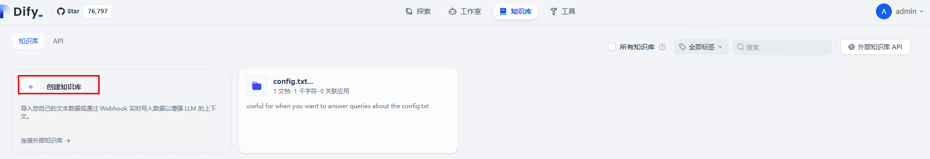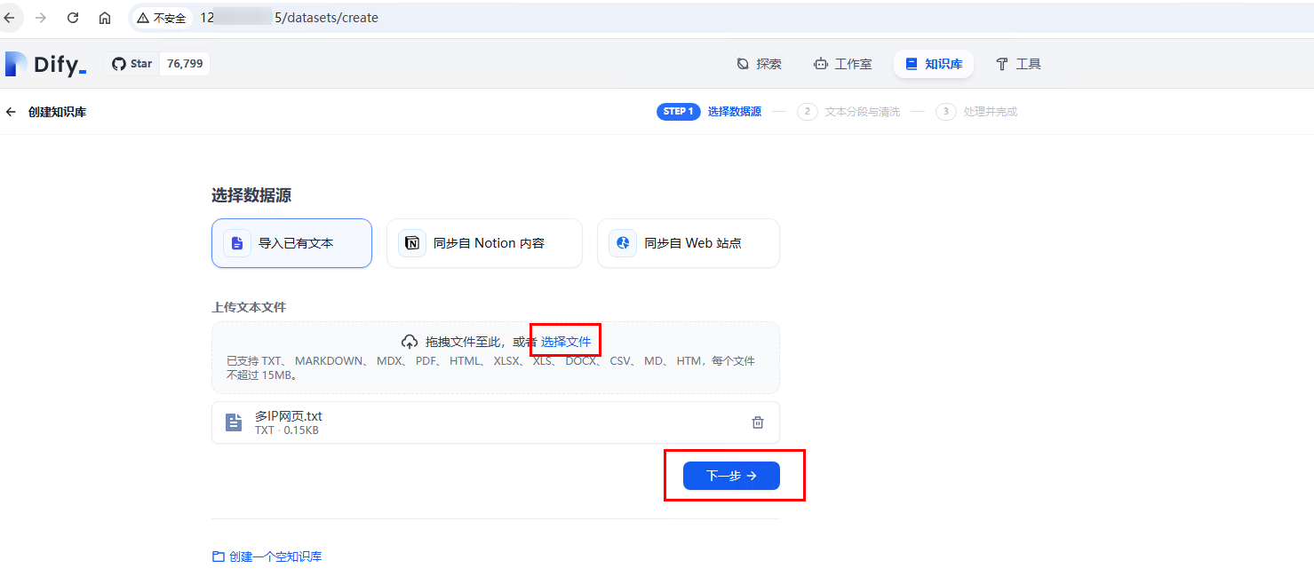 步骤6 创建知识库:访问Dify服务的弹性公网IP地址,依次单击“知识库”,“创建知识库”上传文本文件后单击“下一步”。