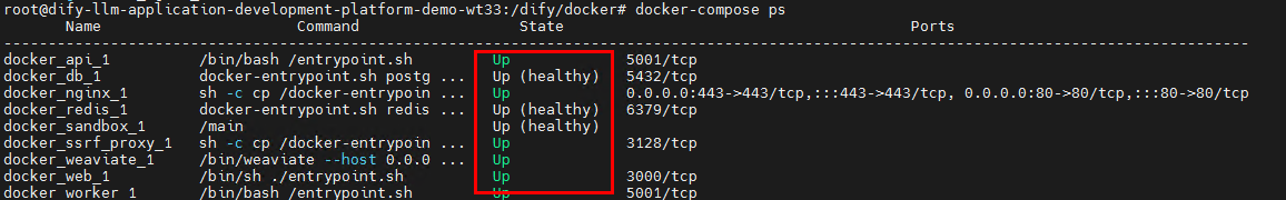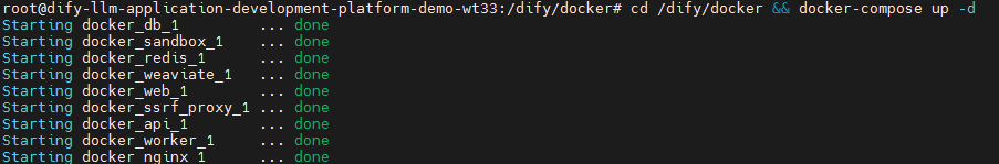 步骤5 启动Dify服务:执行 cd /dify/docker && docker-compose up -d 命令启动Dify服务并在后台运行,执行 docker-compose ps 命令查看容器的状态为 Up 。
