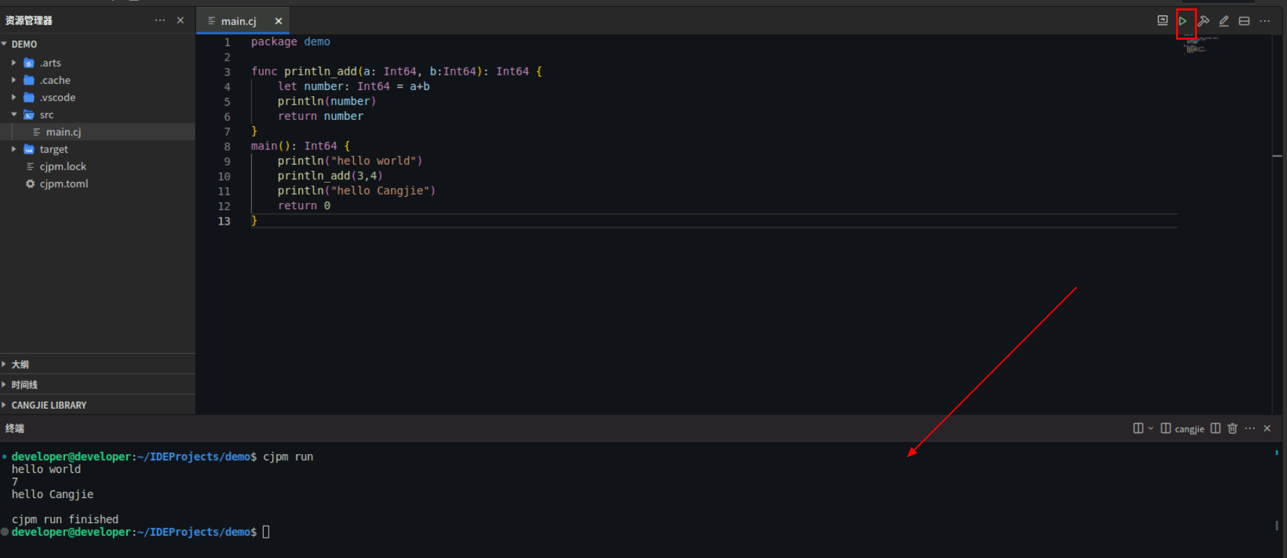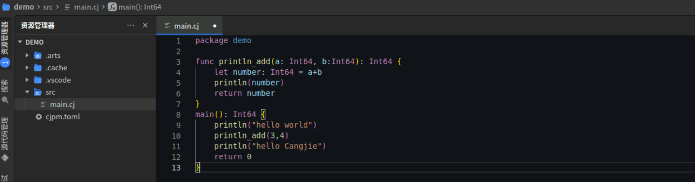 创建项目后,打开src目录下main.cj文件,在预置代码中增加函数和函数调用代码。