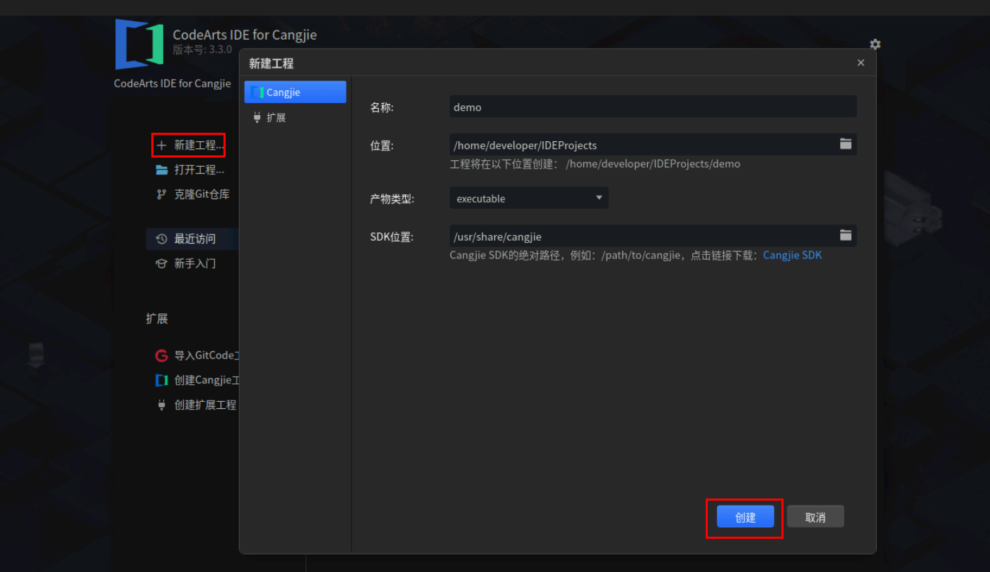 点击新建工程创建仓颉工程,名称和位置可以自定义,产物类型选择executable。