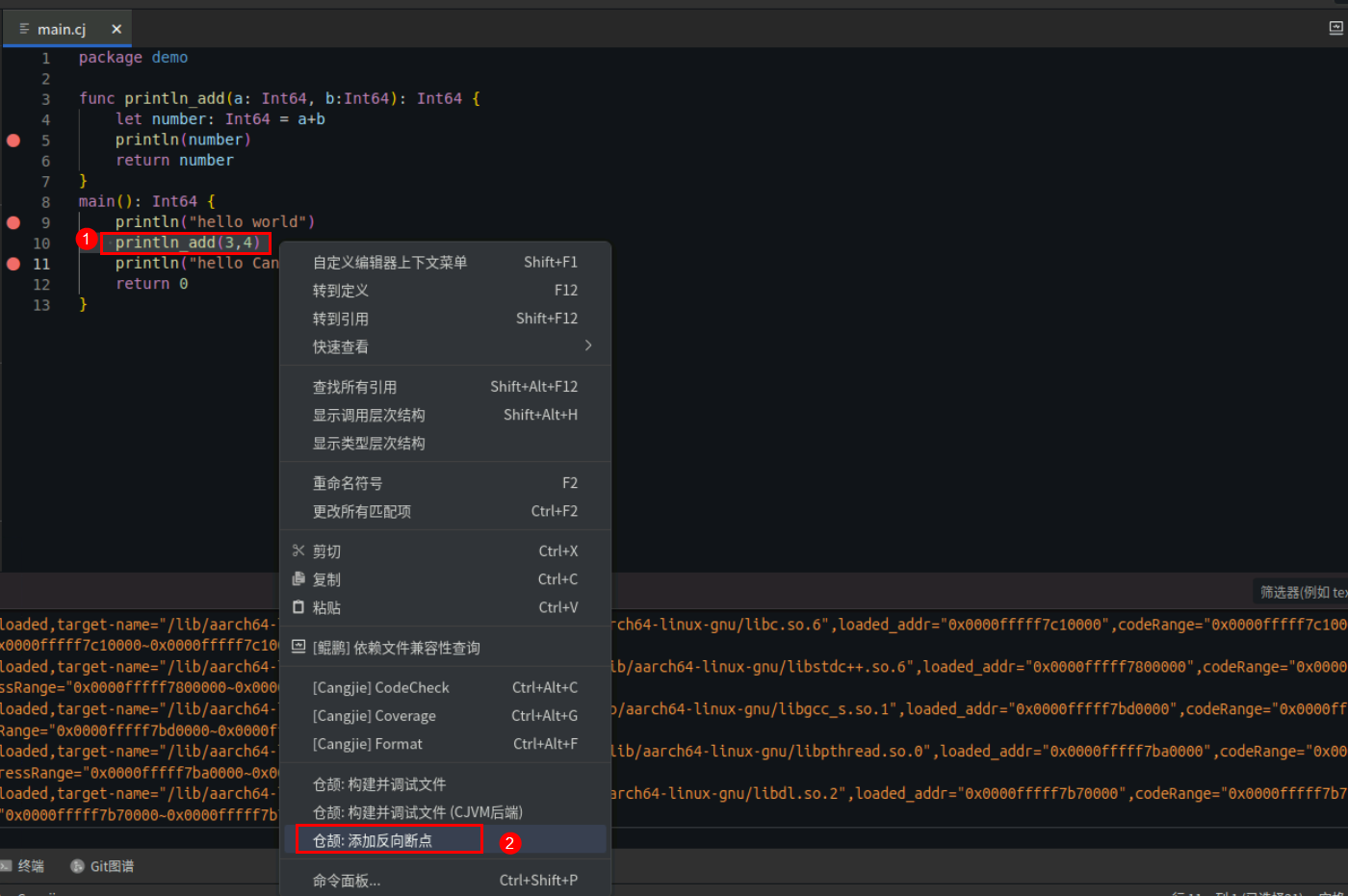 给main.cj打反向断点,选中“println_add(3,4)”行,然后鼠标右键,选择仓颉:添加反向断点。