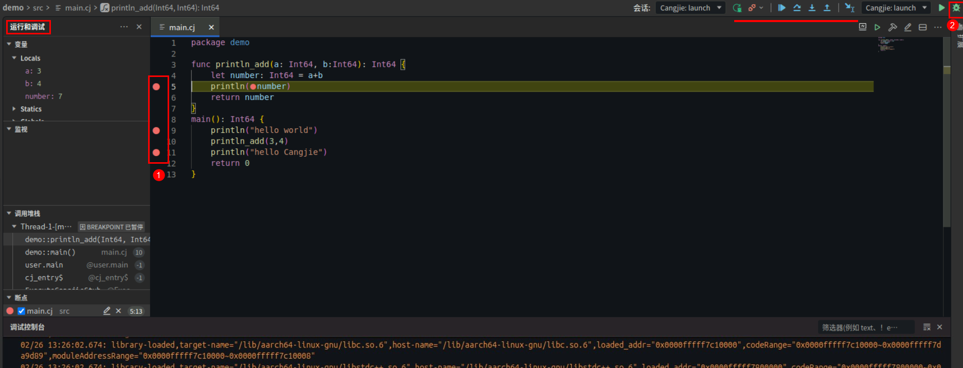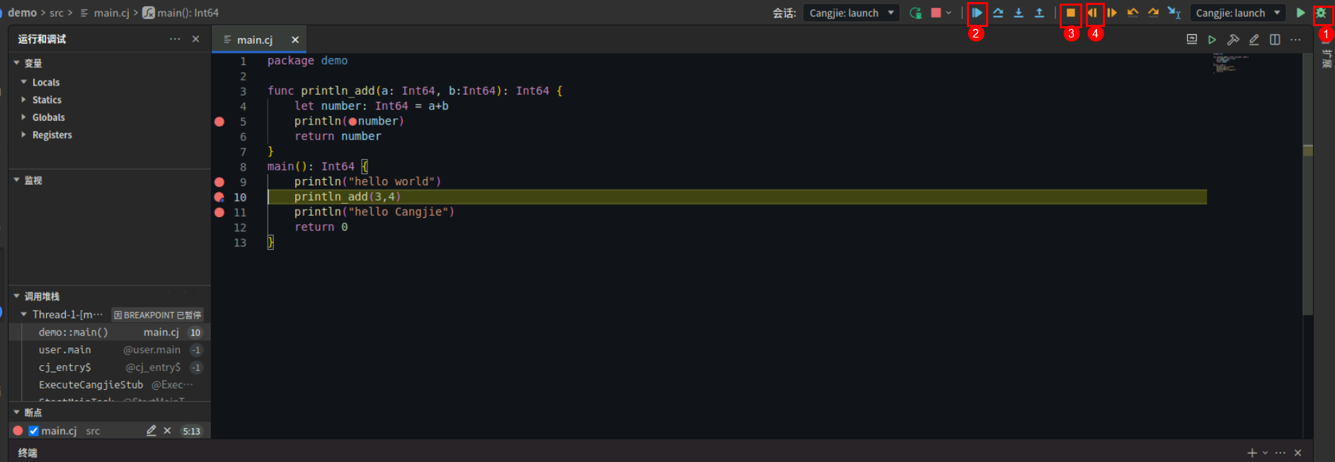 然后可以在main.cj代码中设置断点,再次点击调试按钮。可以在顶部看到调试按钮,在左侧看到调试过程中的变量、监视、调用堆栈、断点信息。