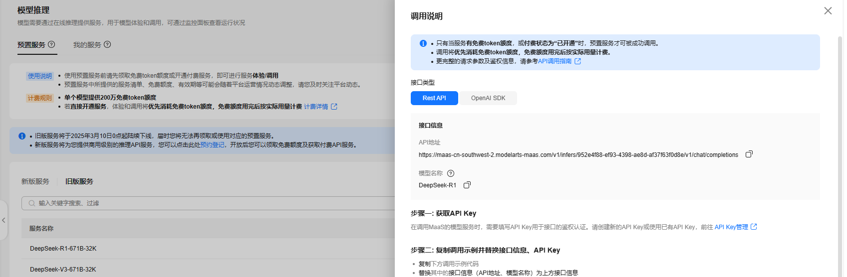 进入ModelArts Studio控制台首页,在左侧菜单栏,选择模型推理,在旧版服务中选择DeepSeek-R1-671B-xxK模型点击领取。