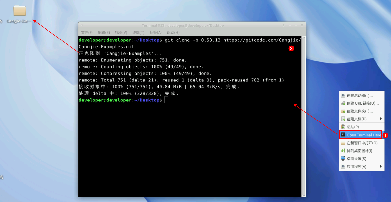 进入云主机桌面,右键选择Open Terminal Here打开终端命令窗口,克隆仓颉示例代码仓库。
