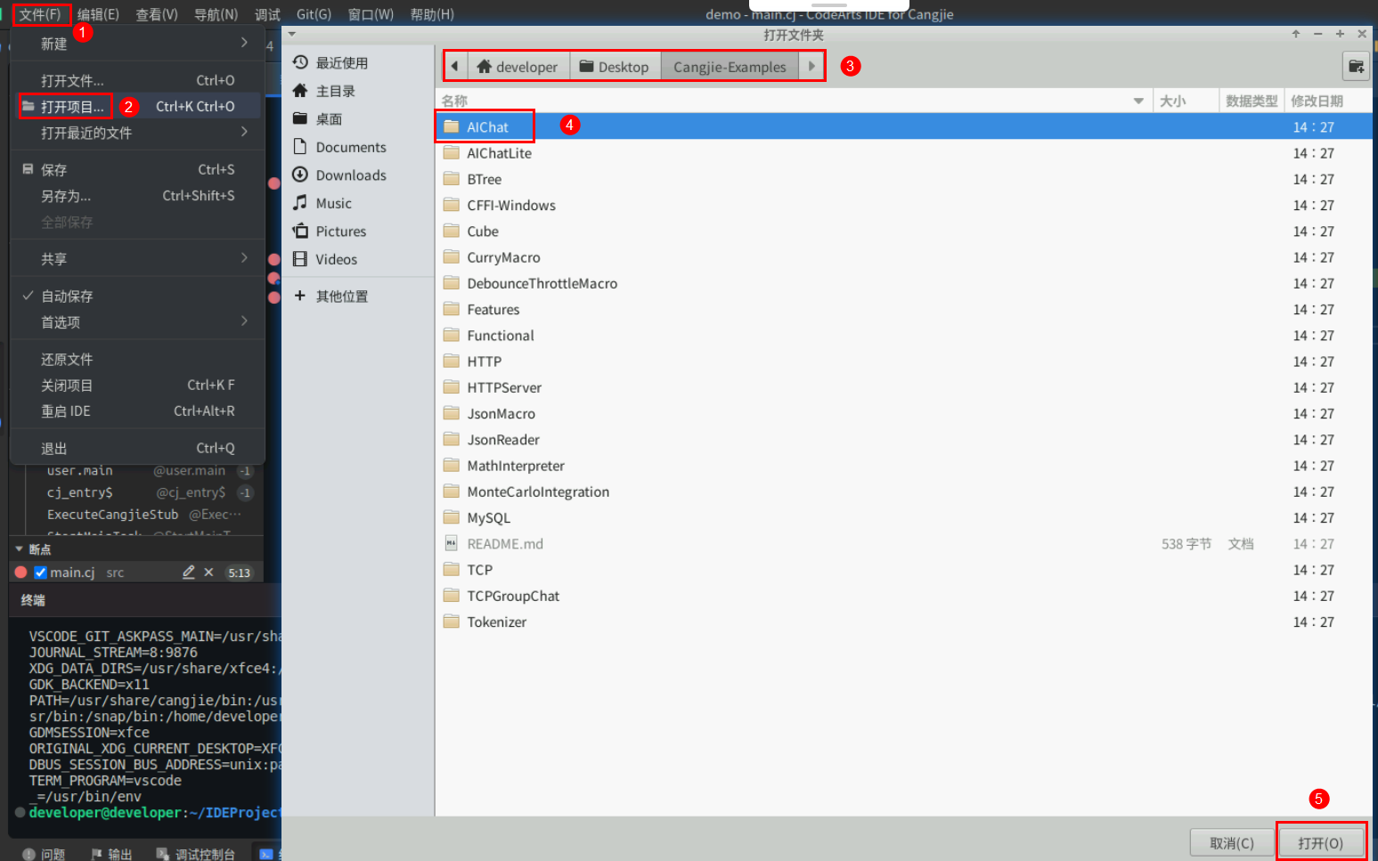 使用CodeArts IDE for Cangjie打开AIChat示例项目。左上点击文件—打开项目,选择前面克隆的示例代码目录Cangjie-Examples下的AIChat打开。
