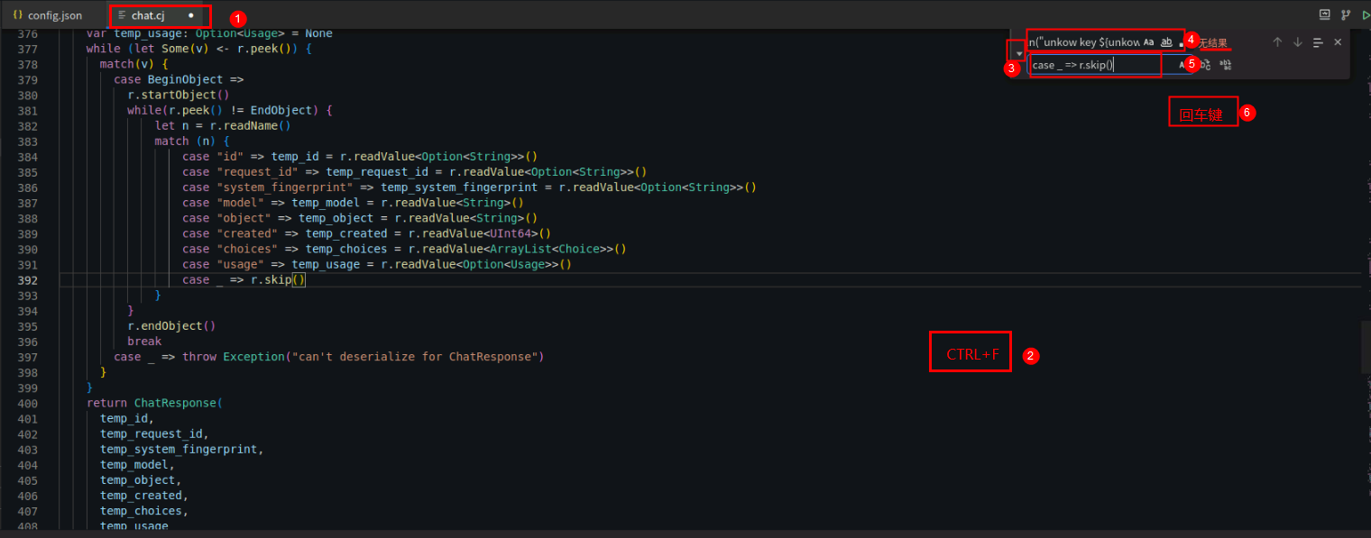 修改AIChat文件夹下的chat.cj中的数据格式化解析代码,解决解析未知key时直接报:unkow key xxx问题。即chat.cj中“case unkow => println("unkow key ${unkow}")”替换为“case _ => r.skip()”。