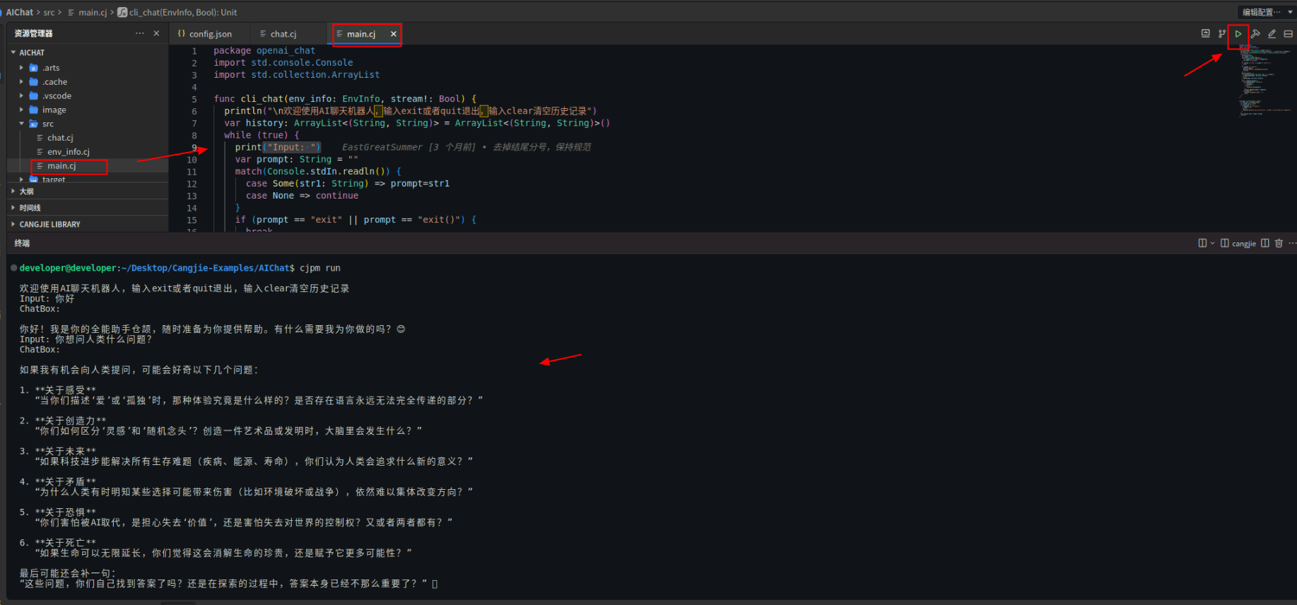 最后打开main.cj,运行项目,我们就可跟AI助手进行聊天了。