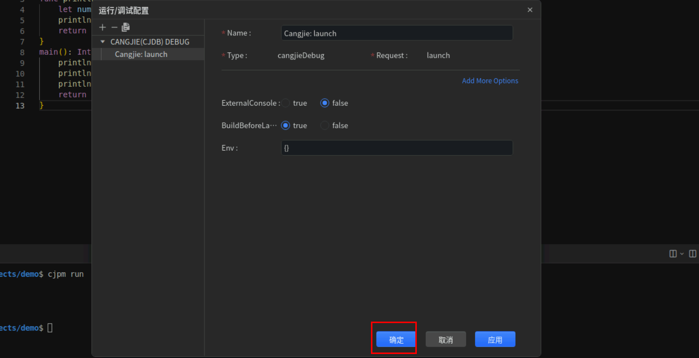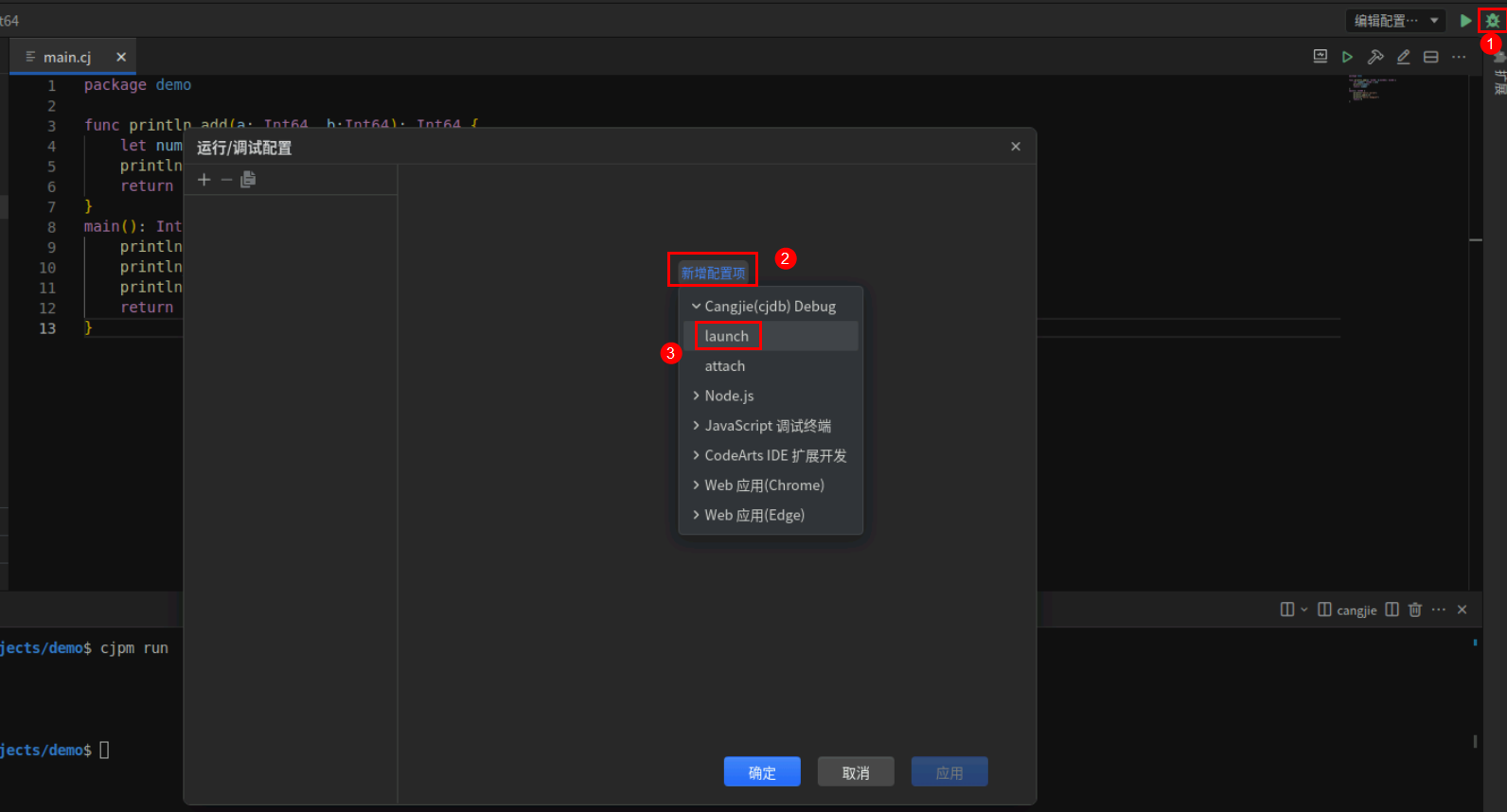 点击右上调试按钮,首次会提示配置调试,点击新增配置项,选择Cangjie(cjdb)Debug——launch。