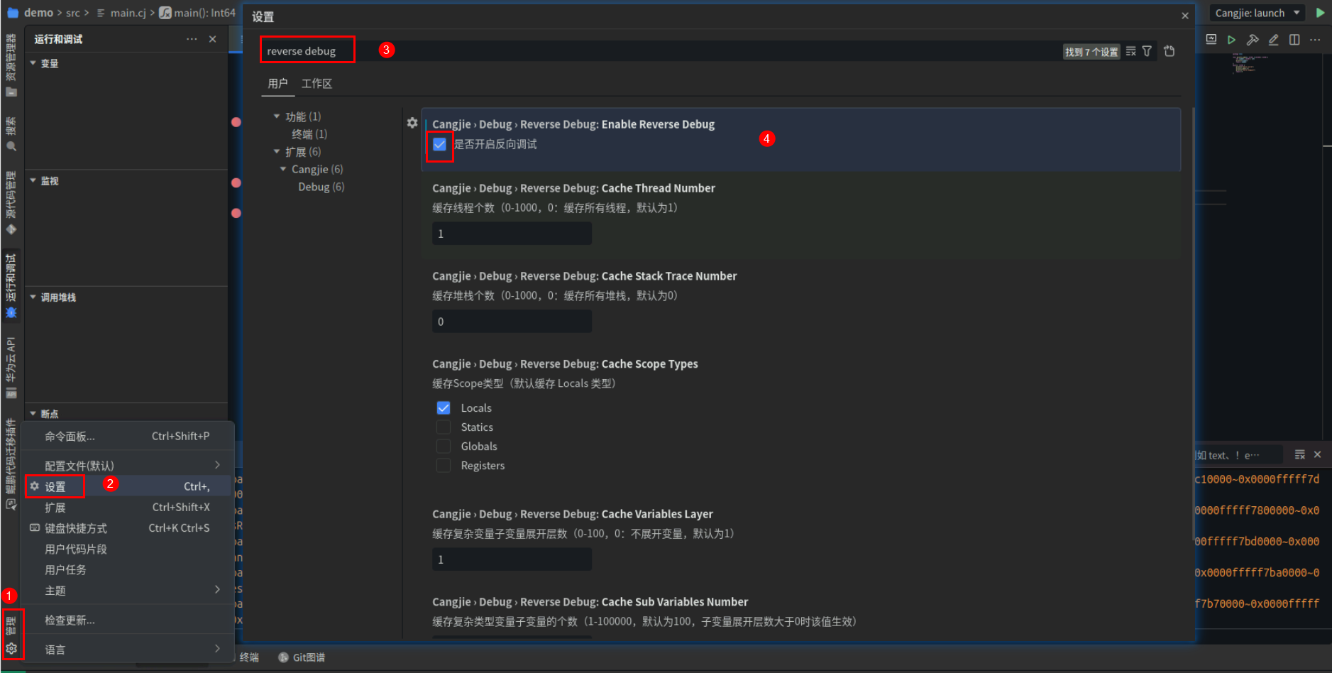 在编辑器左下点击管理—设置,搜索reverse debug,开启反向调试。