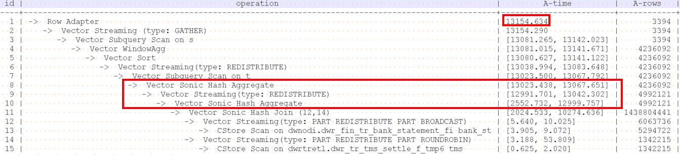 优化后语句的执行效果如下,其中GROUP BY的耗时(HashAgg+redistribute)占比为((13067.651-10274.636)/13154.634 = 21%。其中可以明显看到重分布时间(stream算子)明显缩短
