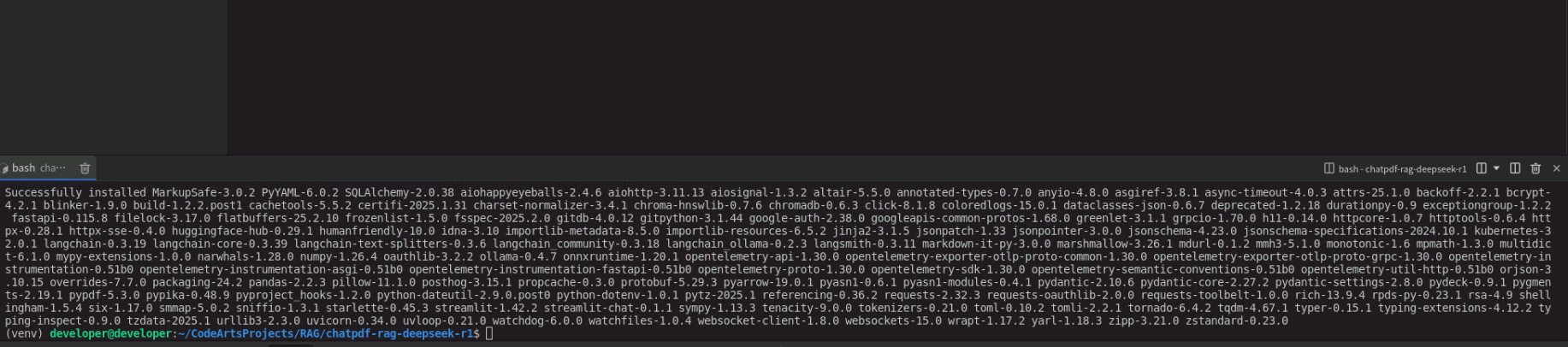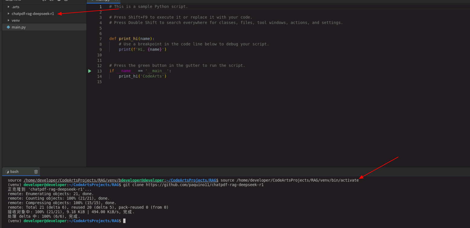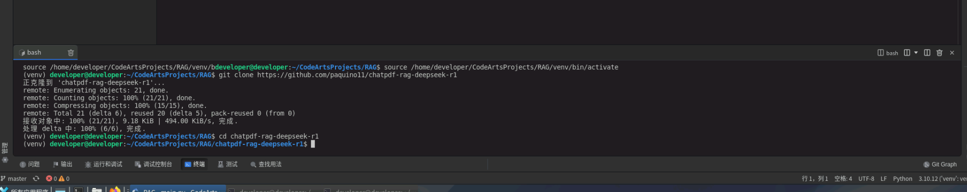 左下角打开终端输入命令,入完毕后按下回车进行下载。下载完毕后,在左侧目录下出现chatpdf-rag-deepseek-r1文件夹表示下载成功。