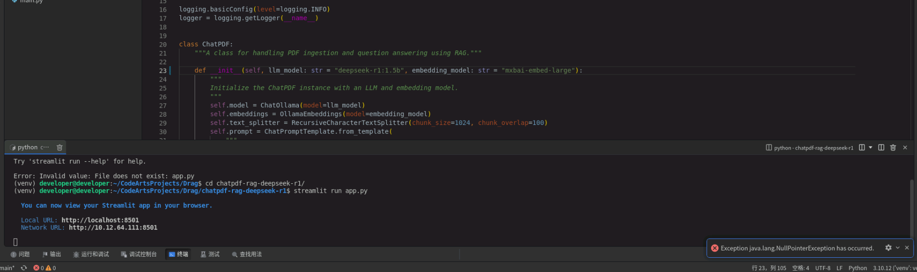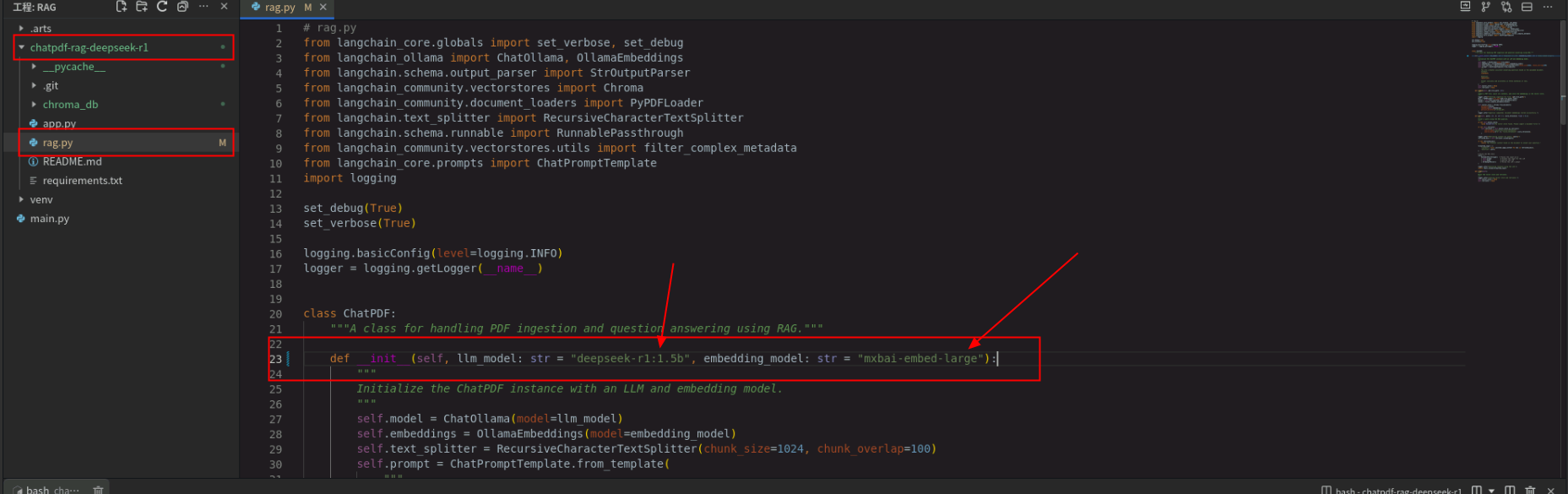 下载完毕后,点击后进入chatpdf-rag-deepseek-r1目录,对rag.py文件进行修改。修改rag.py文件的第23行代码,修改后的效果如下:
