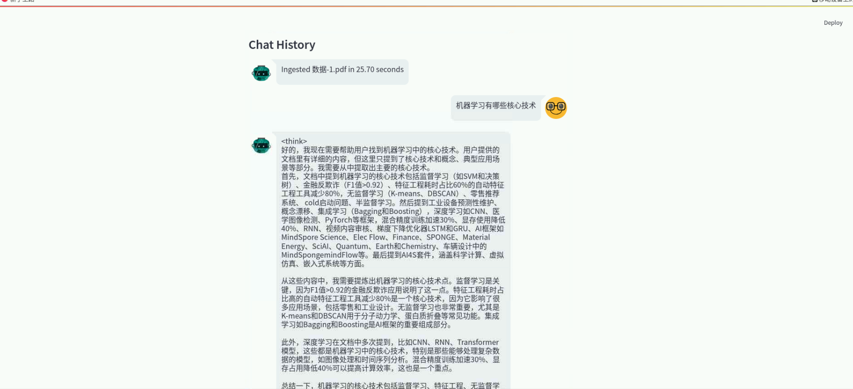 上传后等待读取(过程需要一点时间请耐心等待),数据中包含AI方面的基础知识,所以我们进行问题提问,这里提问:机器学习有哪些核心技术?,输入完毕后回车发送消息。