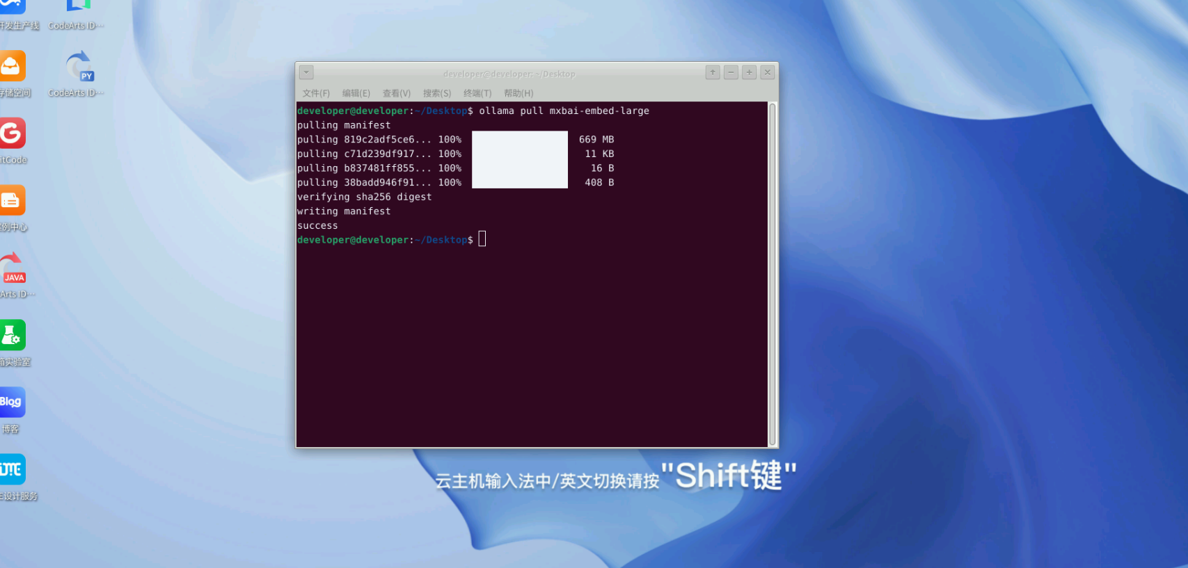 在桌面重新打开一个终端将以下命令复制进去,下载mxbai-embed-large 词向量模型。