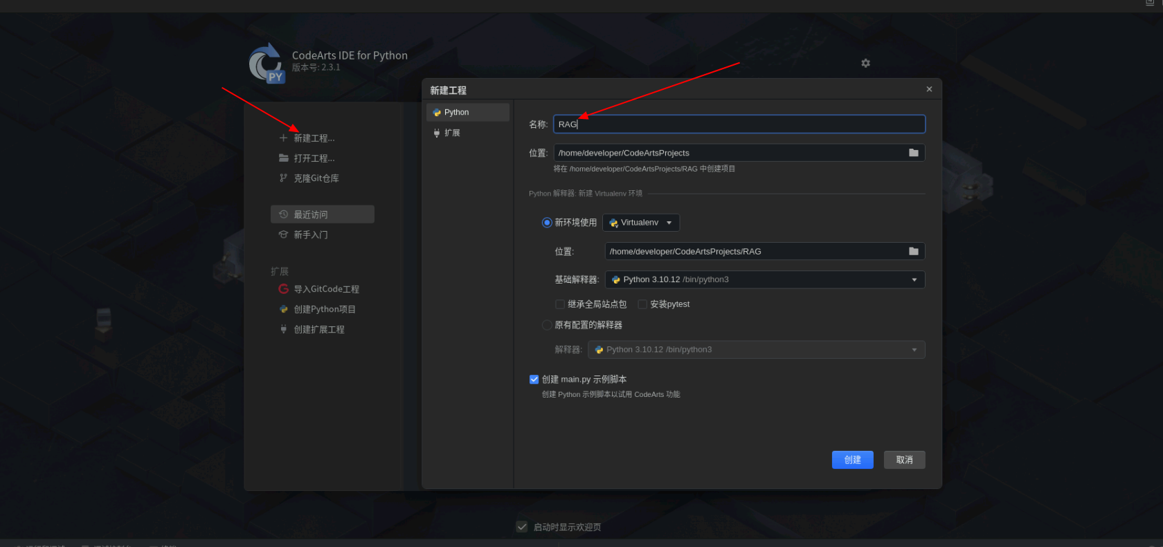 打开后,点击新建工程,输入工程名称:RAG,点击创建。